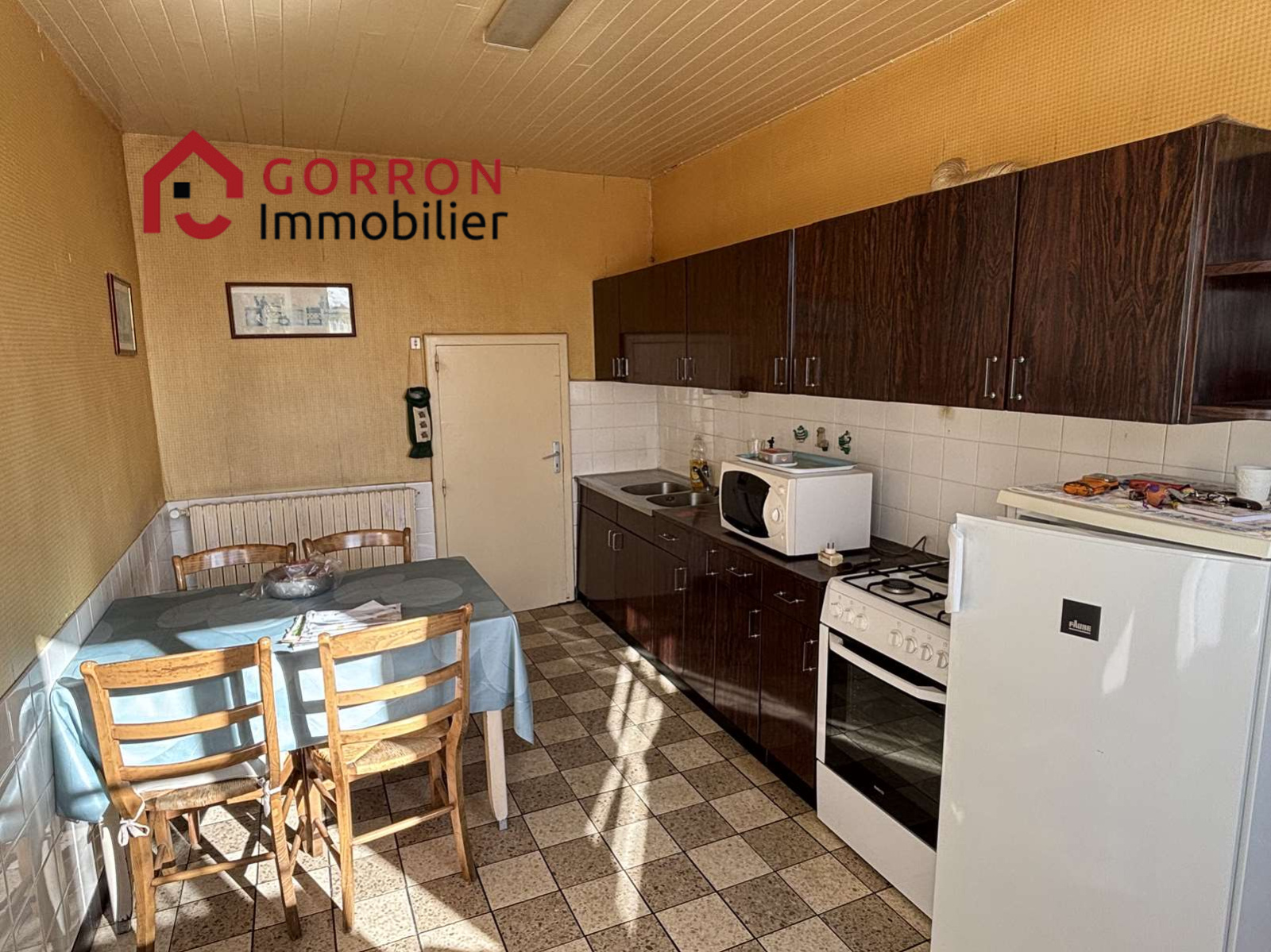 Au rez-de-chaussée : cuisine, salle à manger avec cheminée, salon ou chambre, salle de bain, wc, arrière-cuisine, chaufferie.