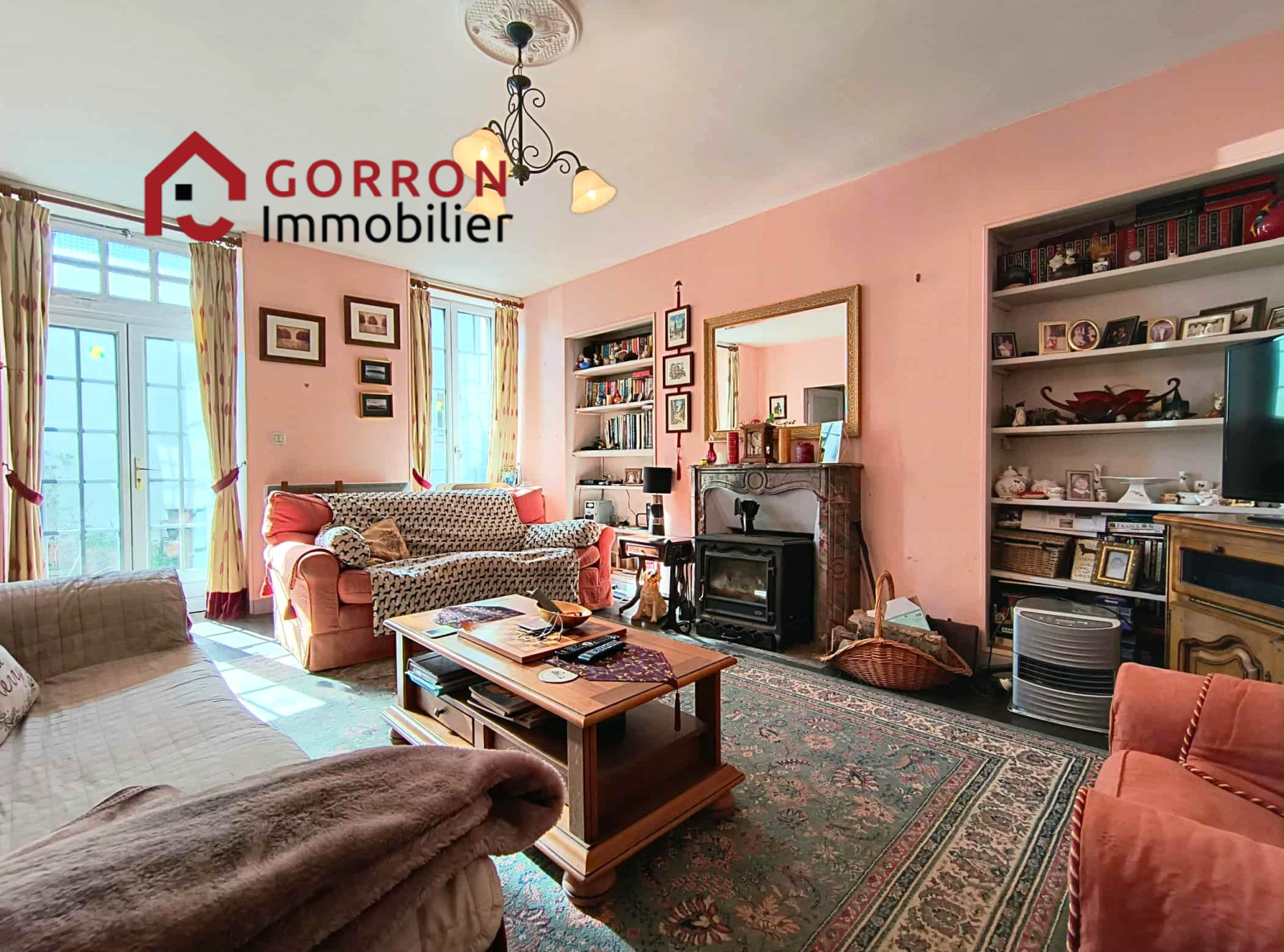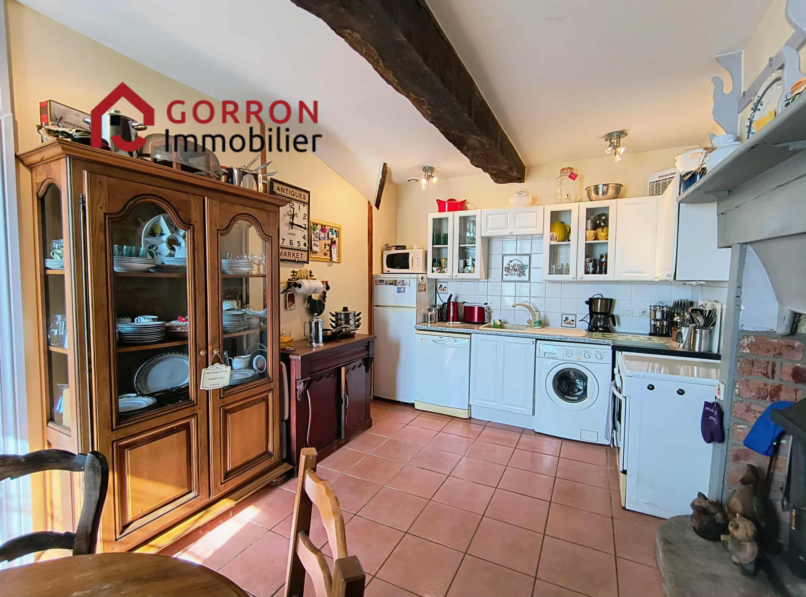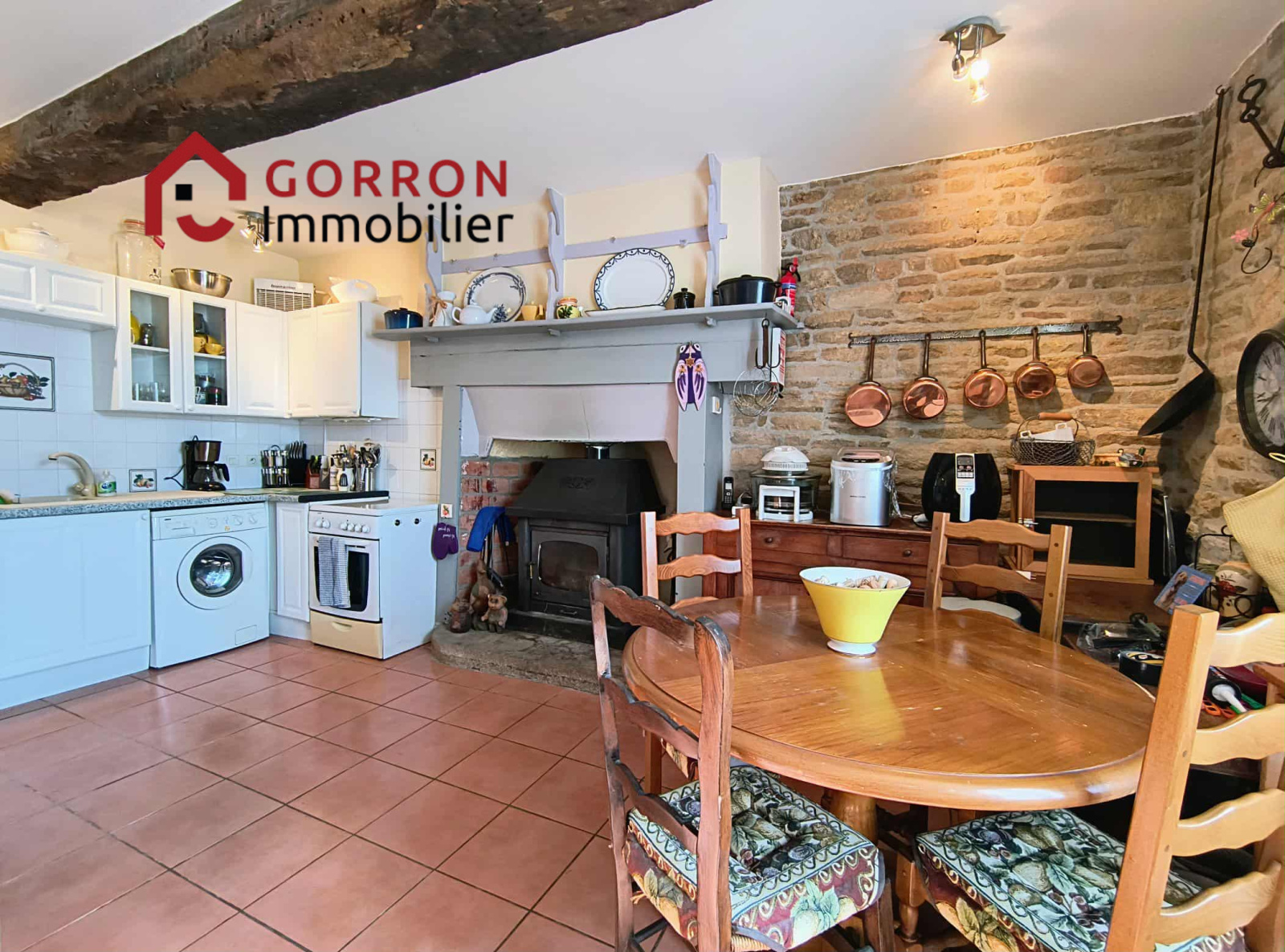 Au rez-de-chausée :hall d'entrée, une cuisine avec poêle à bois, salle à manger, salon avec poêle à bois et accès sur la terrasse, wc,