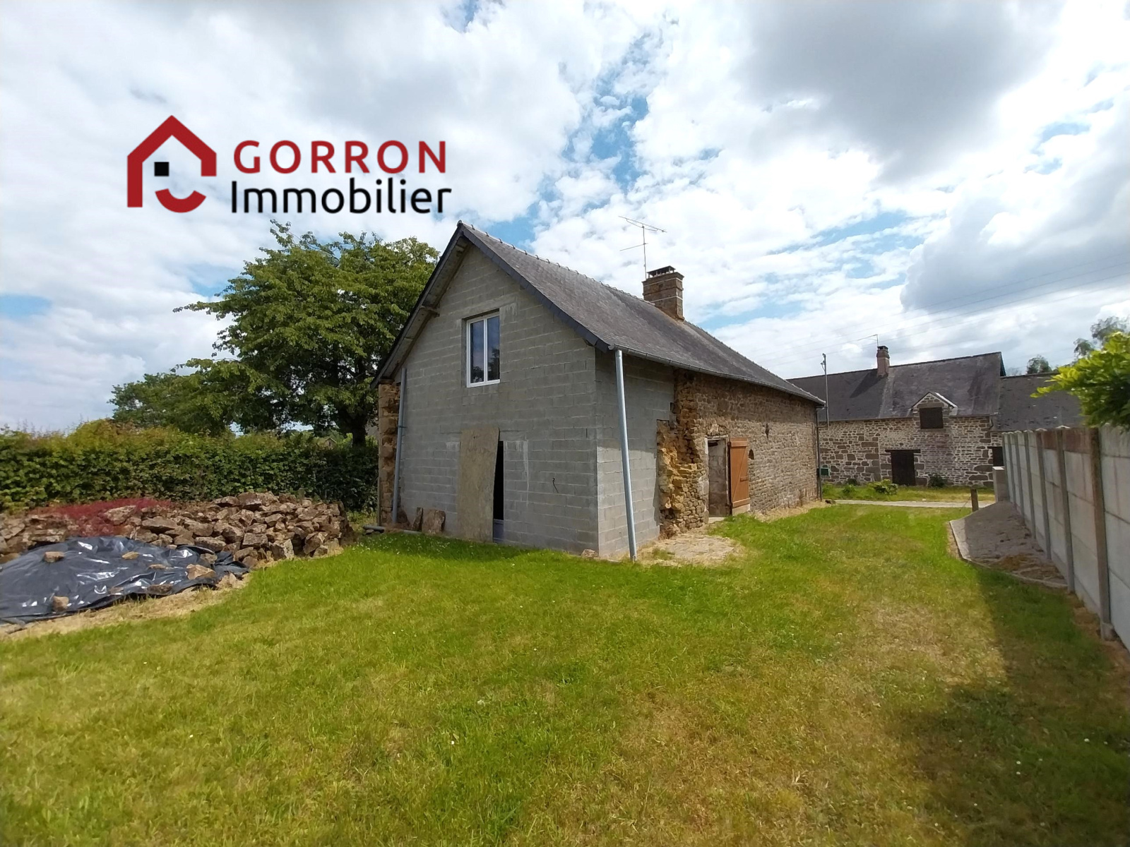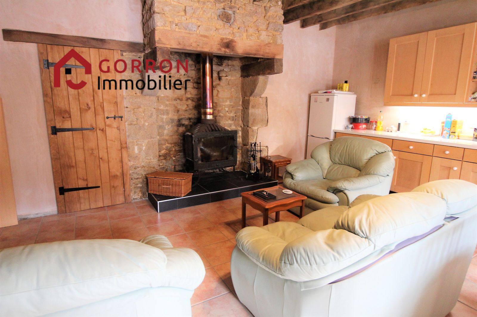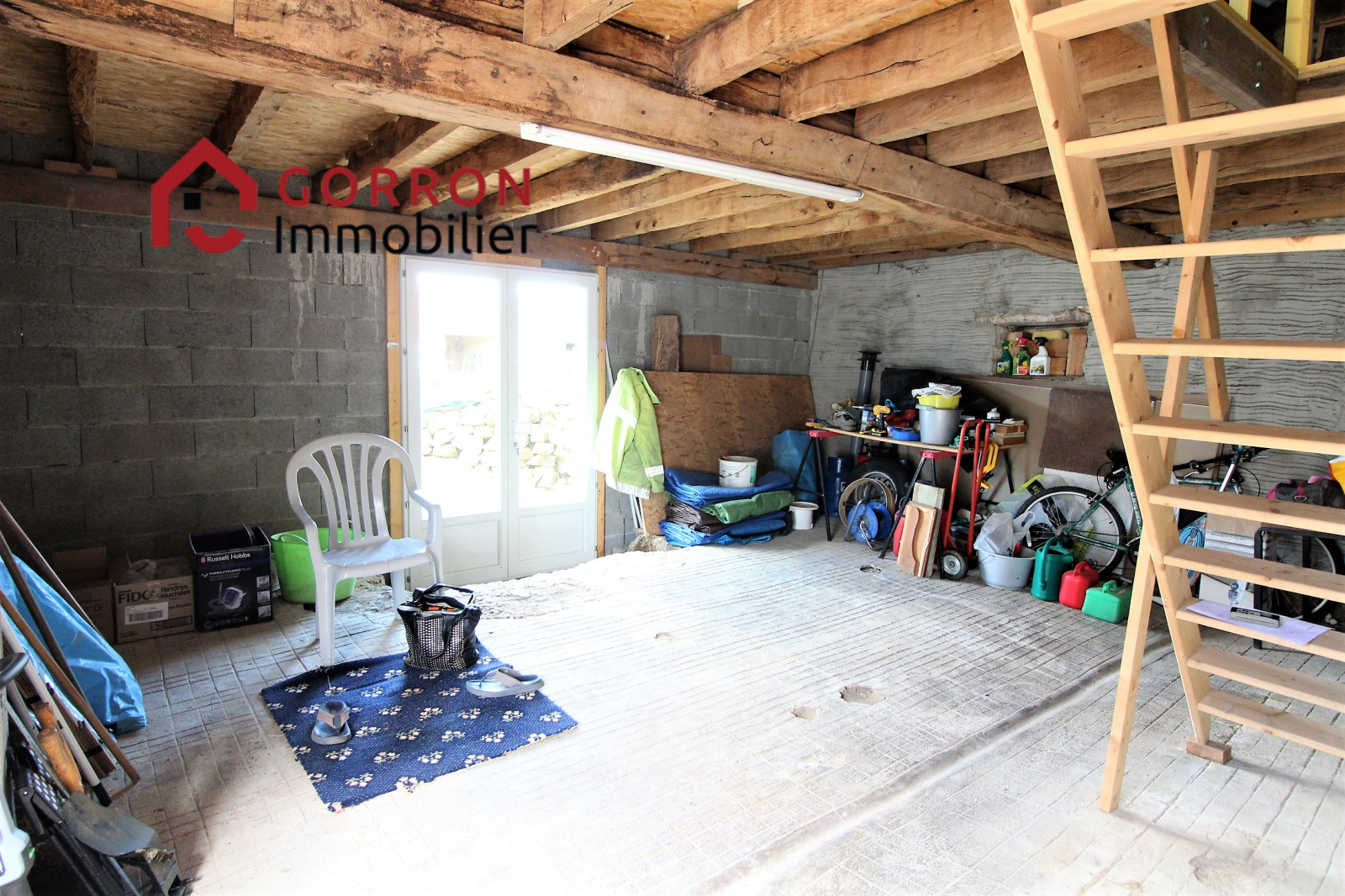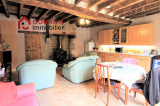 Au RDC : séjour / cuisine aménagée avec poêle à bois, buanderie / salle d’eau avec WC, pièce à rénover avec portes donnant sur le jardin arrière.