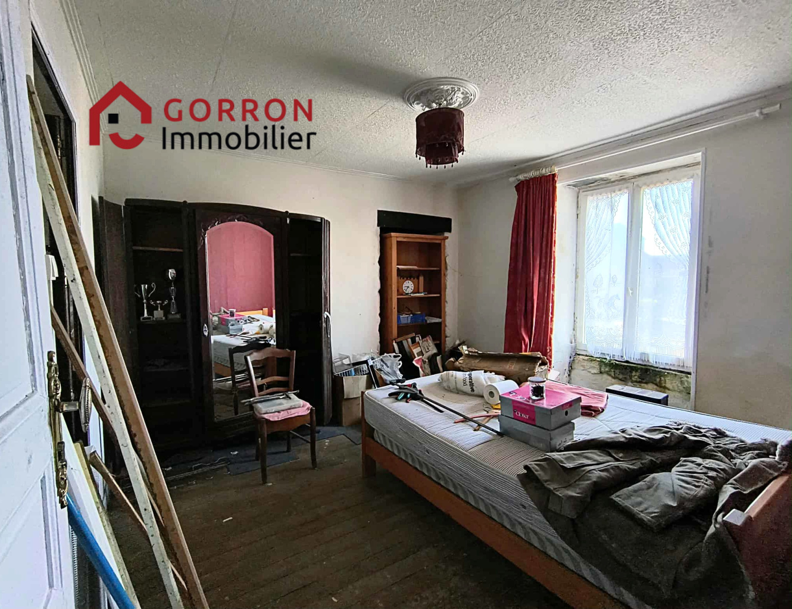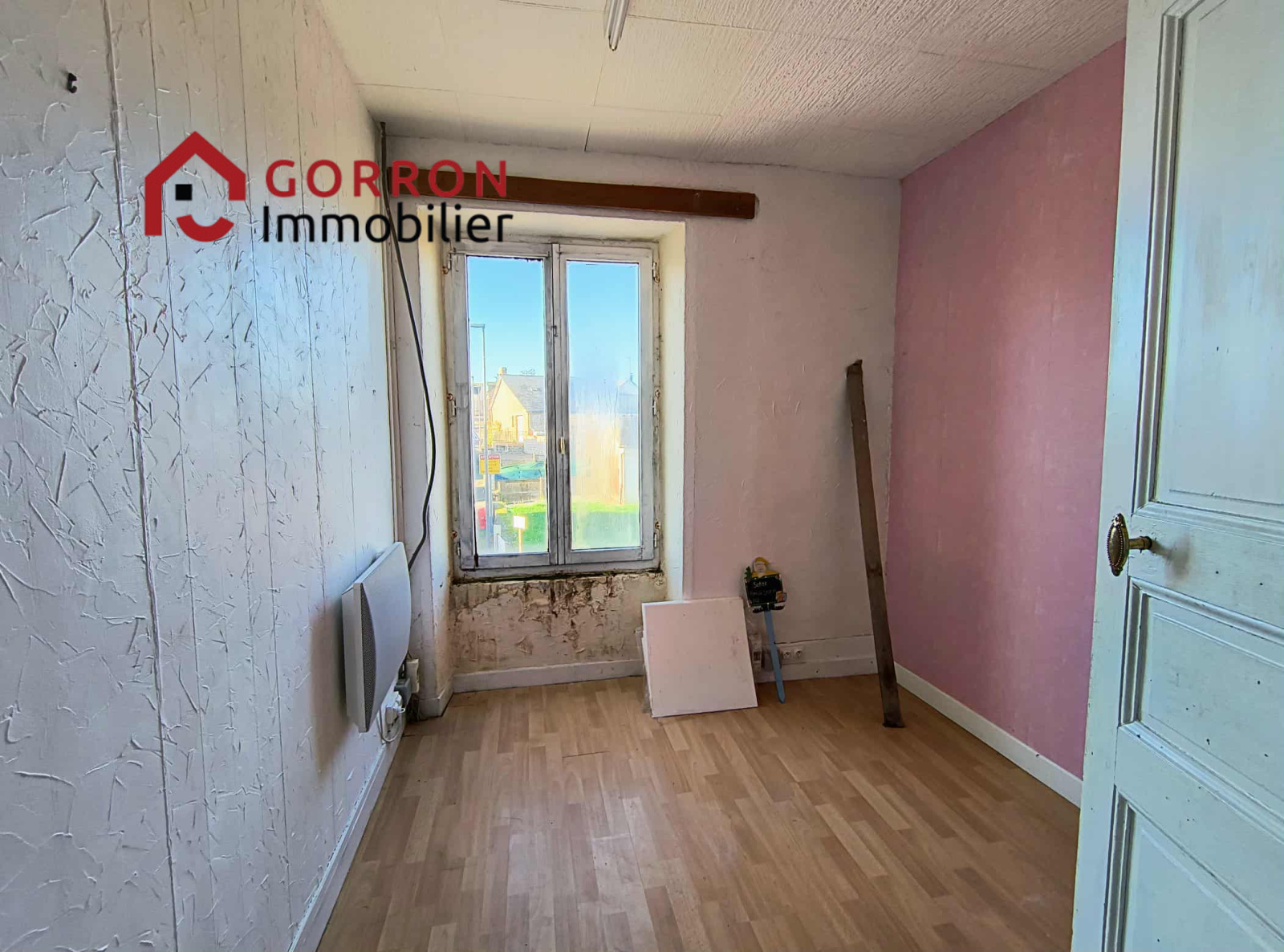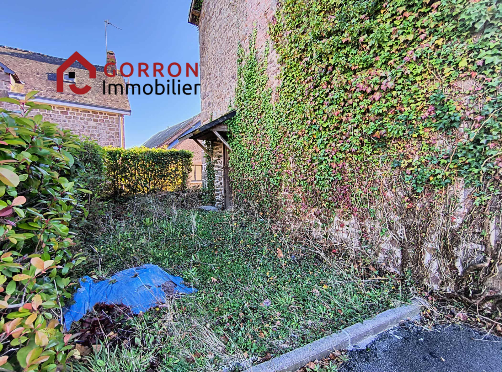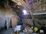 Dans le centre d'un village en bordure d'une rue passante, à env. 10 km de Mayenne, beau potentiel pour cette maison en pierres à rénover (toiture comprise), comprenant :