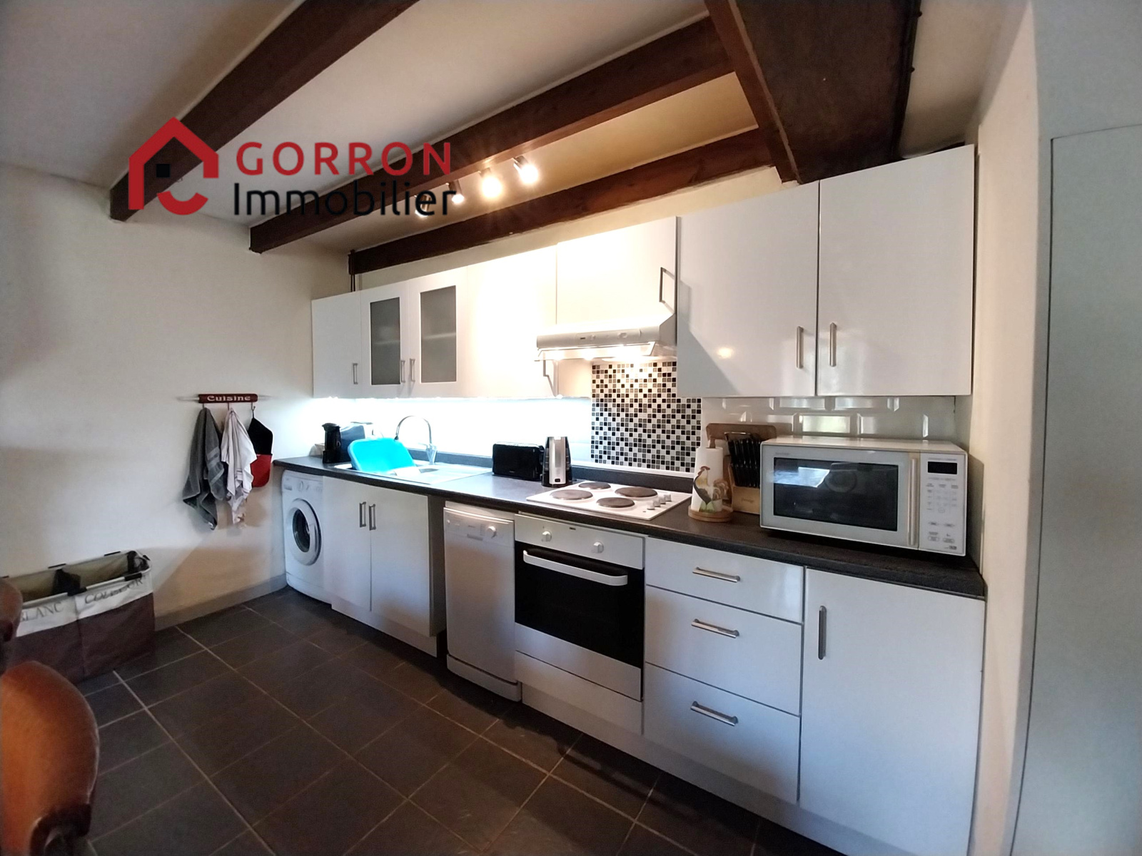 RDC : Entrée menant à une cuisine aménagée / salle à manger avec poêle à bois, salon.