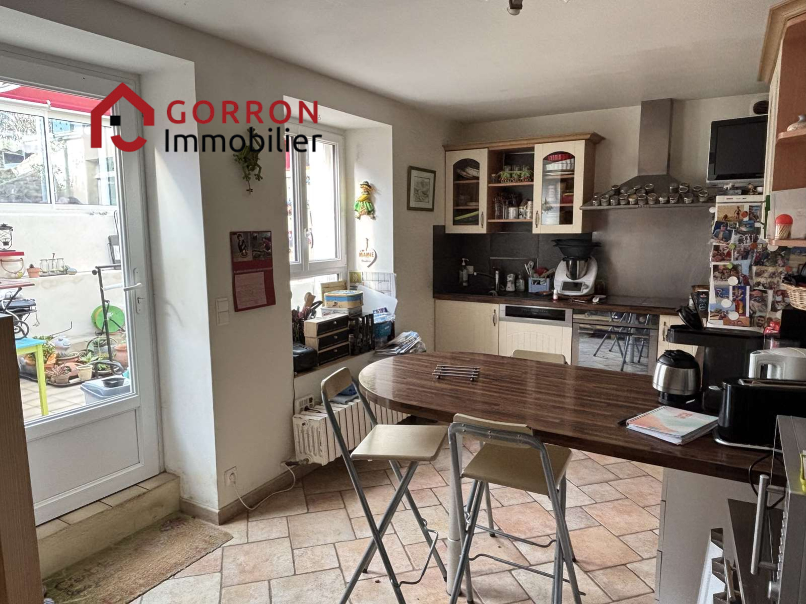 Au rez-de-chaussée : séjour, cuisine aménagée, véranda donnant sur le jardin.
