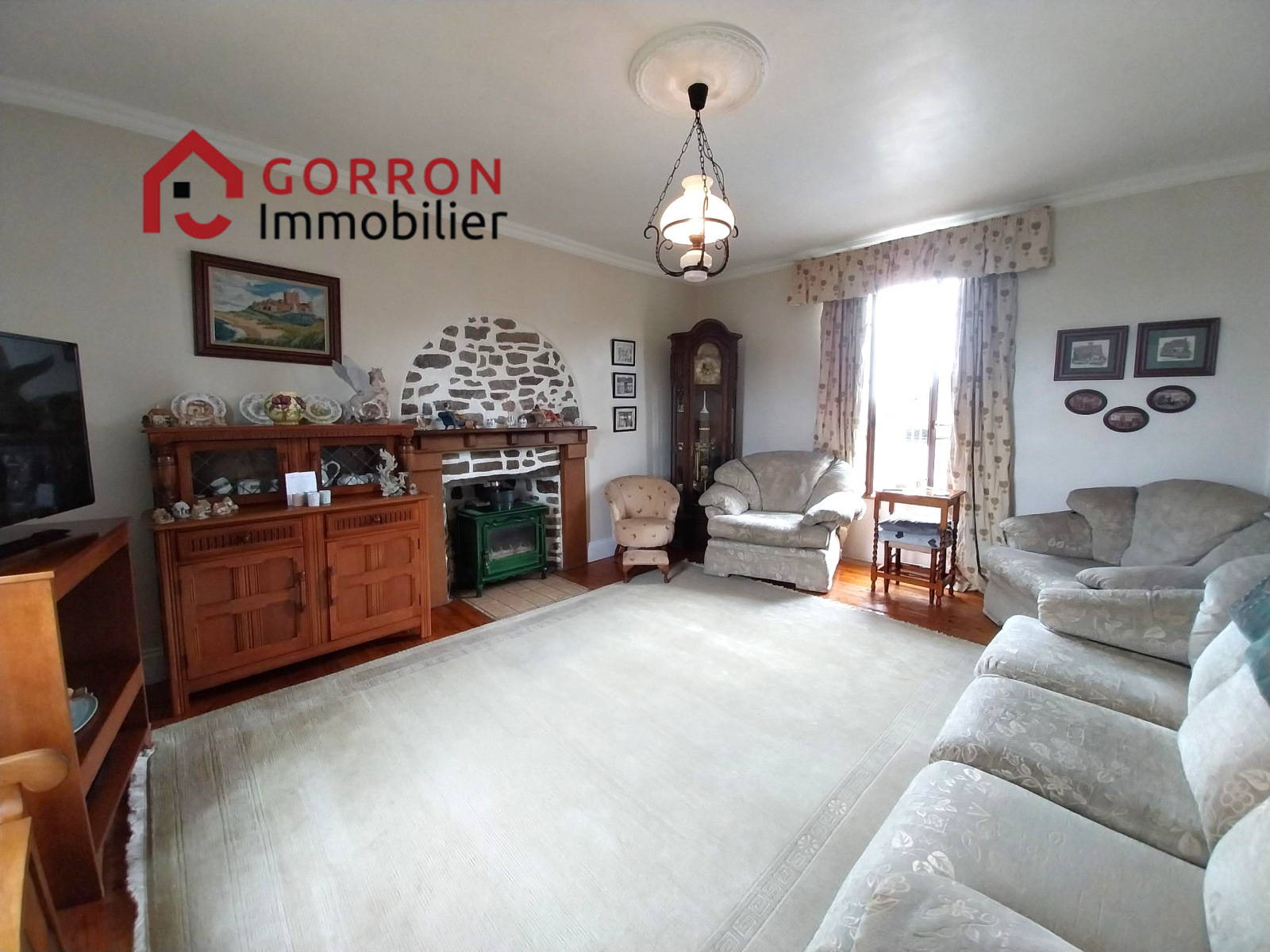 Au 1er étage : salon avec poêle à bois, chambre.