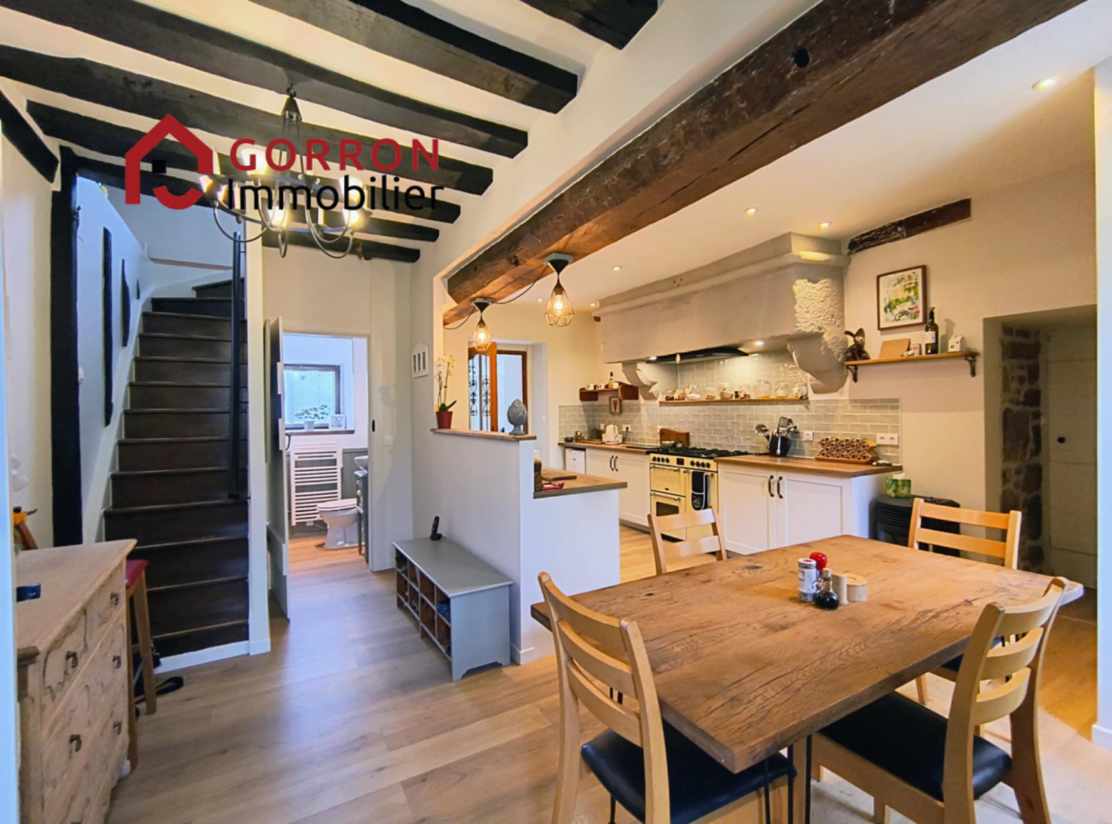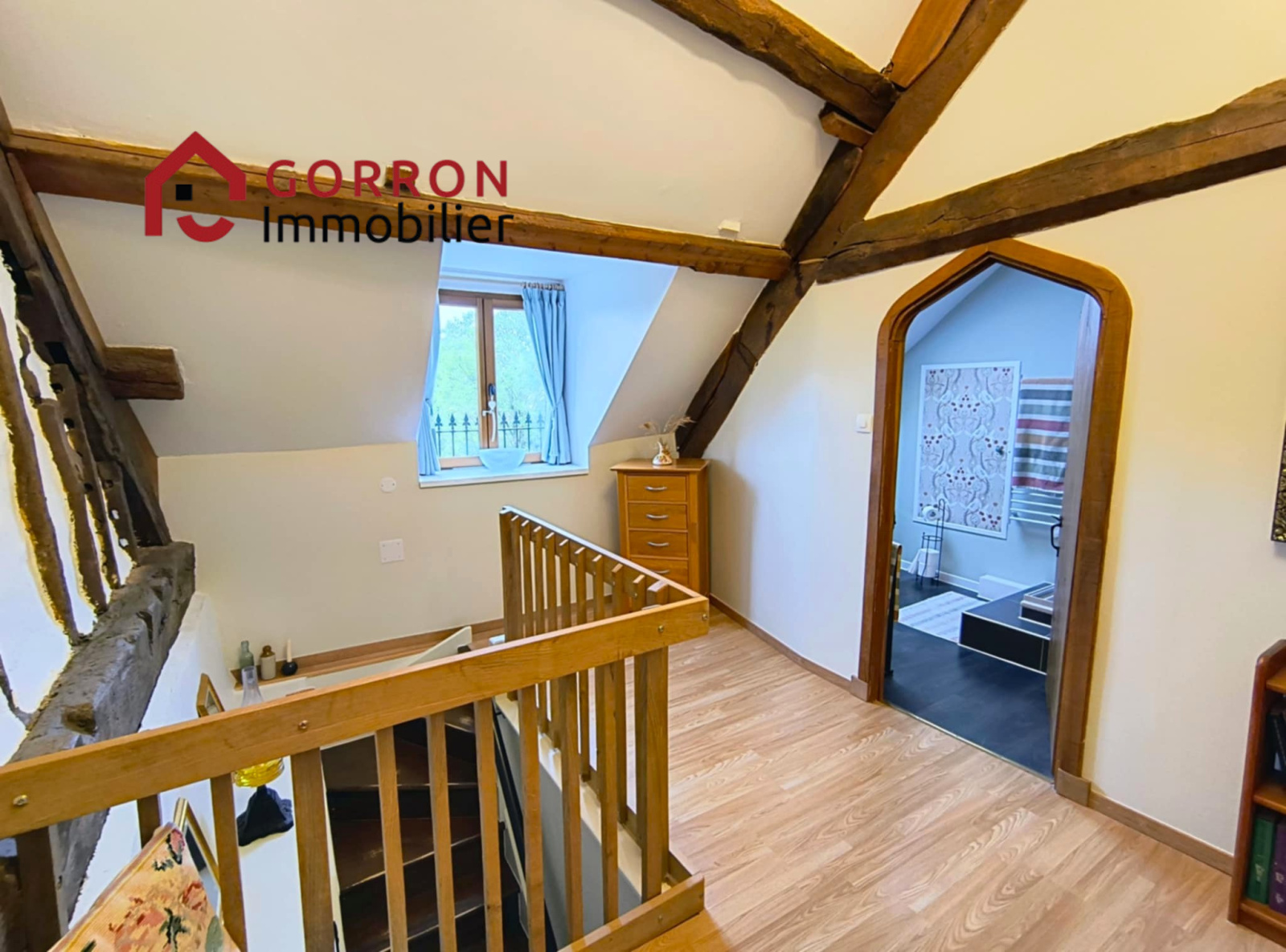 Au rez-de-chaussée : salon avec poêle à bois, cuisine aménagée ouverte sur salle à manger, bureau, buanderie et wc.